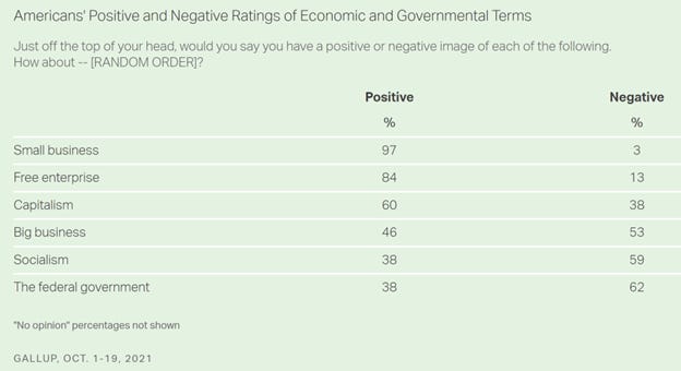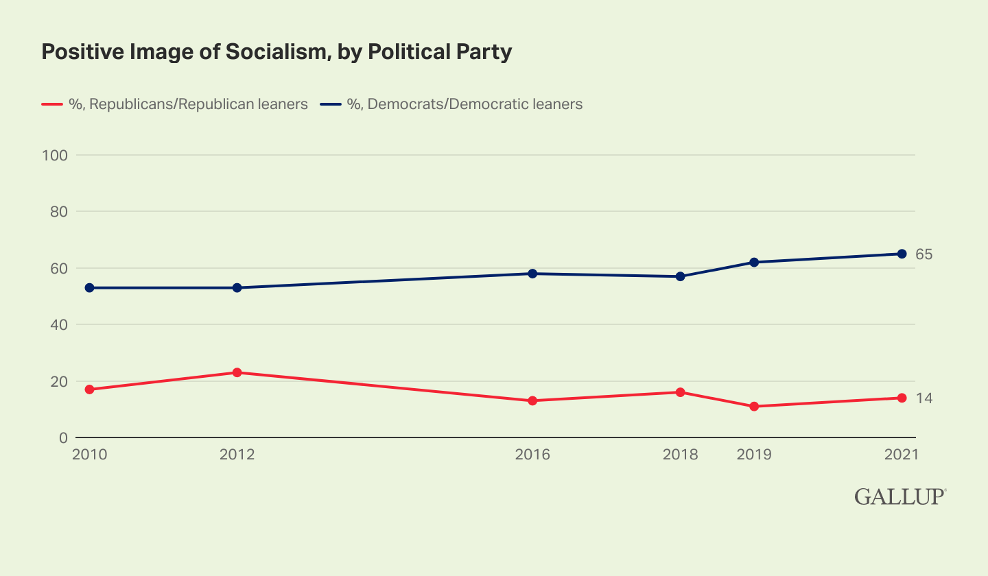 An October 2021 Gallup poll found that in the USA the vast majority of Republicans (72%) had a positive view of capitalism versus socialism (14%), but more Democrats had a positive view of socialism (65%) than capitalism (52%). Support for socialism is a major political divide between partisans.
