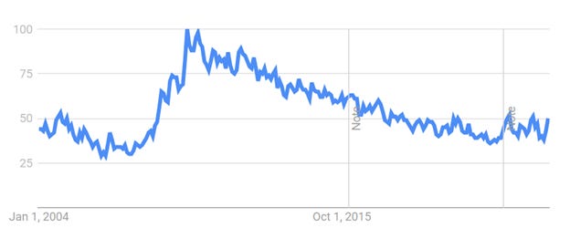 None of this is new. Internet searches for failures of capitalism peaked in 2010 and have mostly declined since. (Capitalism + fail 2004 to present).